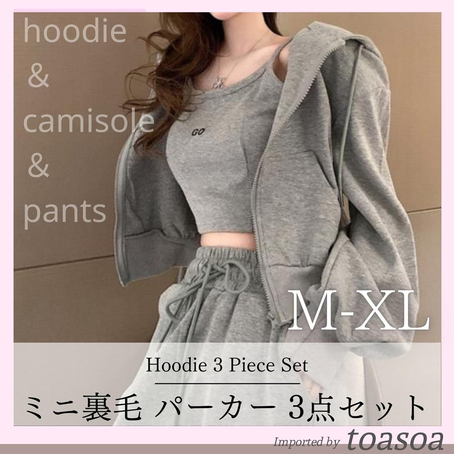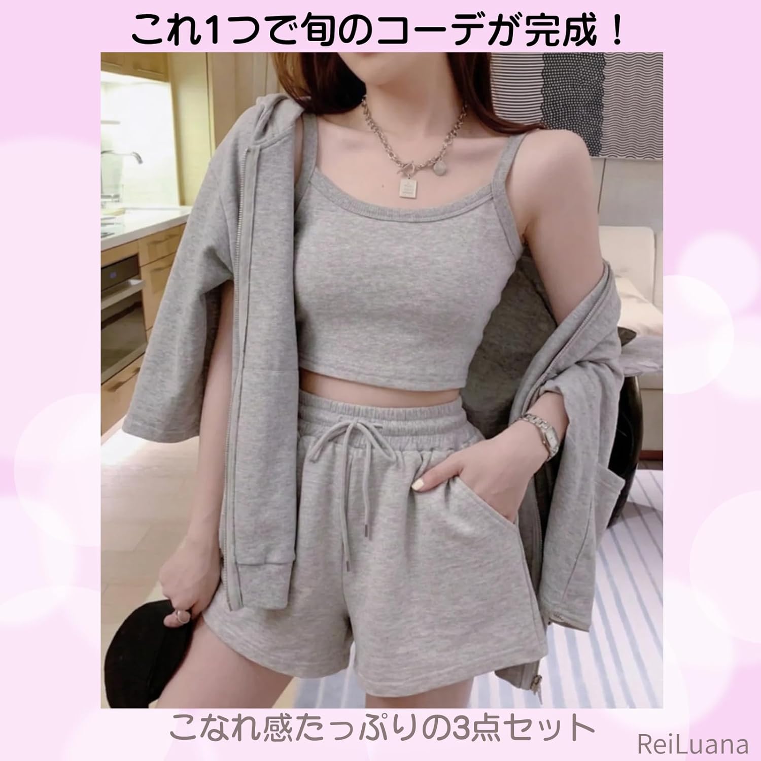 [ReiLuana] スウェット セット アップ ルームウェア レディース 3点 パーカー キャミソール ショートパンツ