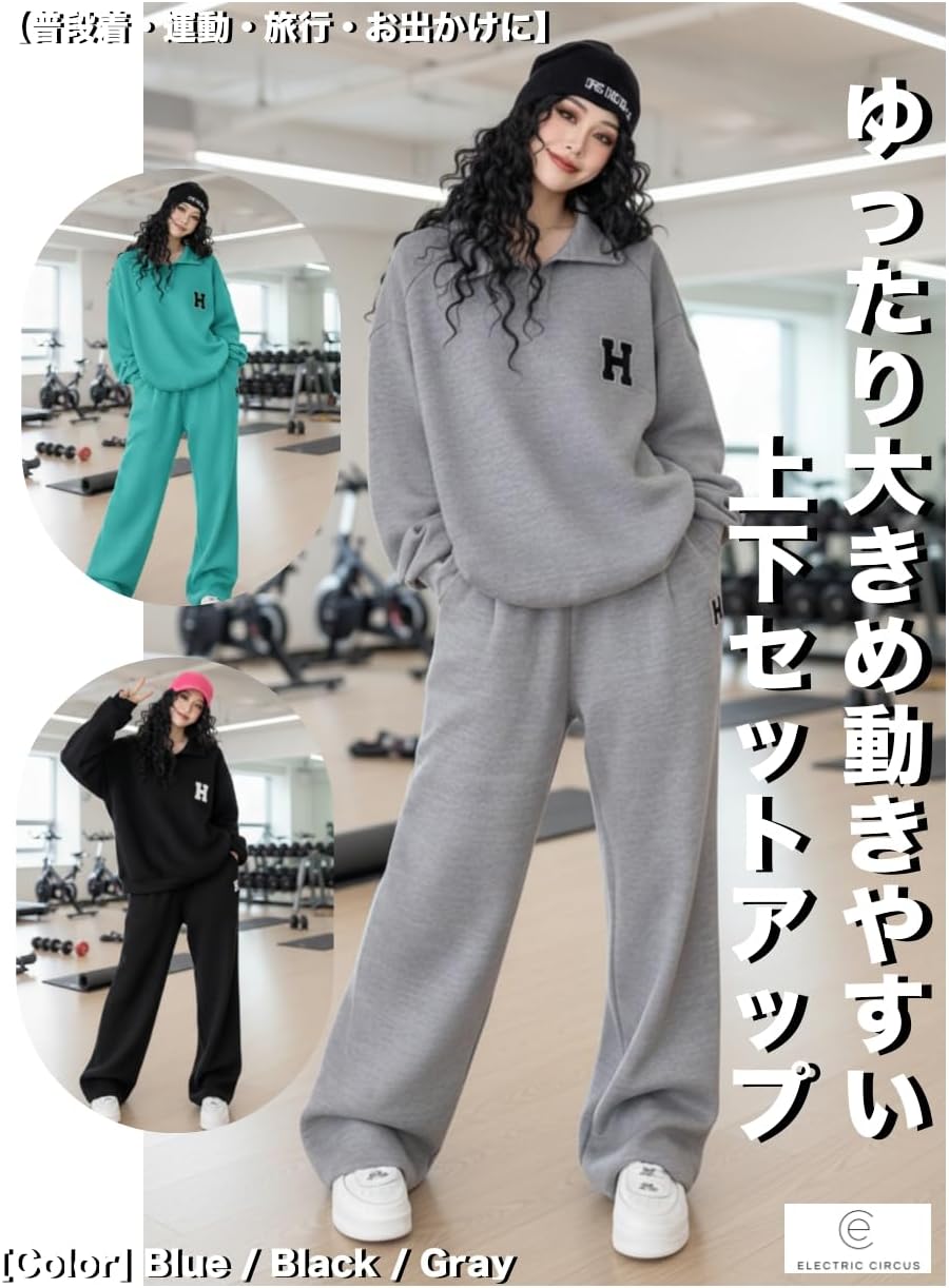[Electric Circus] ゆったり 大きめ トレーナー 上下 セットアップ 春秋 ハーフジップ プルオーバー らくちんウエストゴム