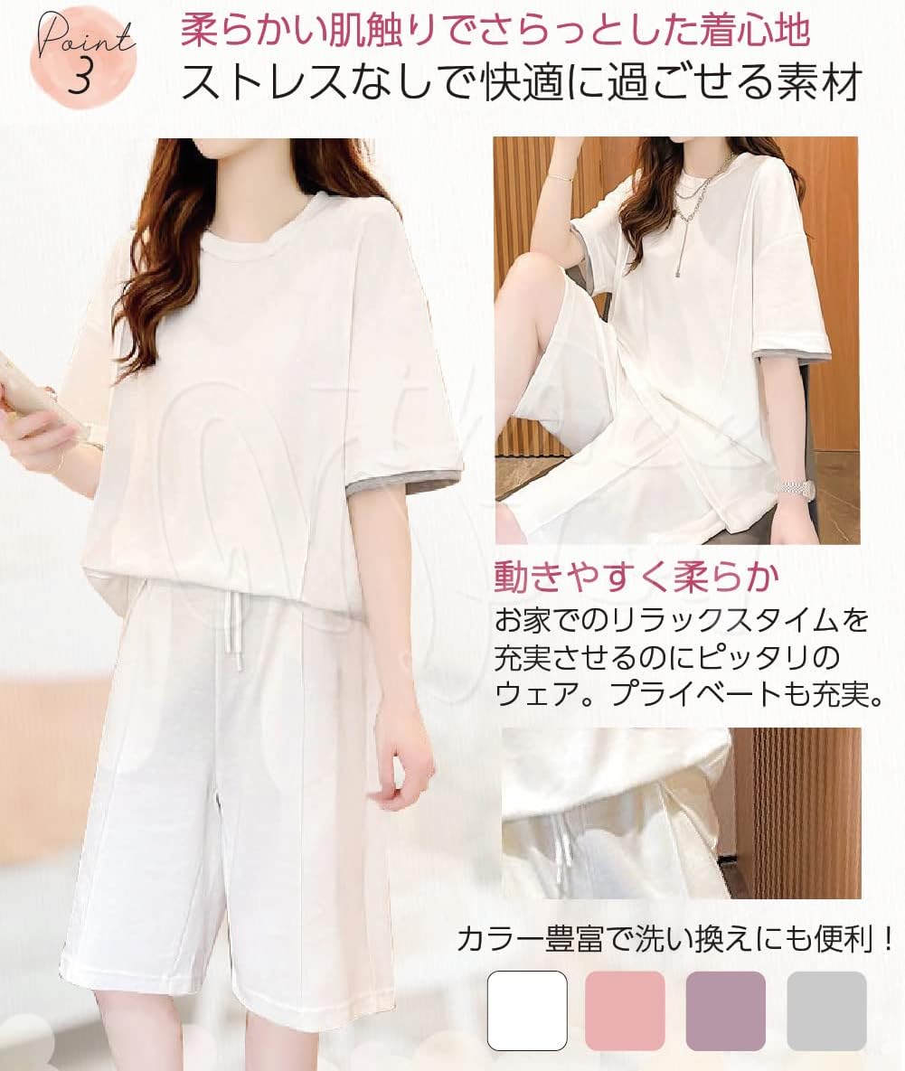 シンプルでかわいい!4色展開!部屋着やパジャマとして、スーパーやコンビニなどちょっとしたお買い物にもお勧めです。 【1枚でお洒落にきまる!】 トップスは袖口のフェイクがお洒落な重ね着風シャツ。ボトムスは気になる部分が隠せるハーフパンツ。上下どちらにも縦ラインの切換えしがあり、細見え効果も◎。 【機能性抜群!】 ちょっとした小物入れに便利なポケットが嬉しいポイント。ゴム仕様のウェストには調節紐があるので、微調整もできます。トップス ボトムス別々でもコーディネートが楽しめます。