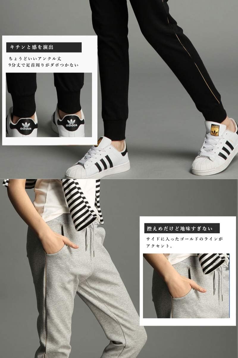 「サイドライン入りとプレーンなライン無しが選べる。 すっきりとしたテーパードシルエット 気になるラインを自然にカバー。 裾リブ付きだから、丈感の調整も自由自在。 裾を調整すれば旬なスニーカーコーデが完成!」
