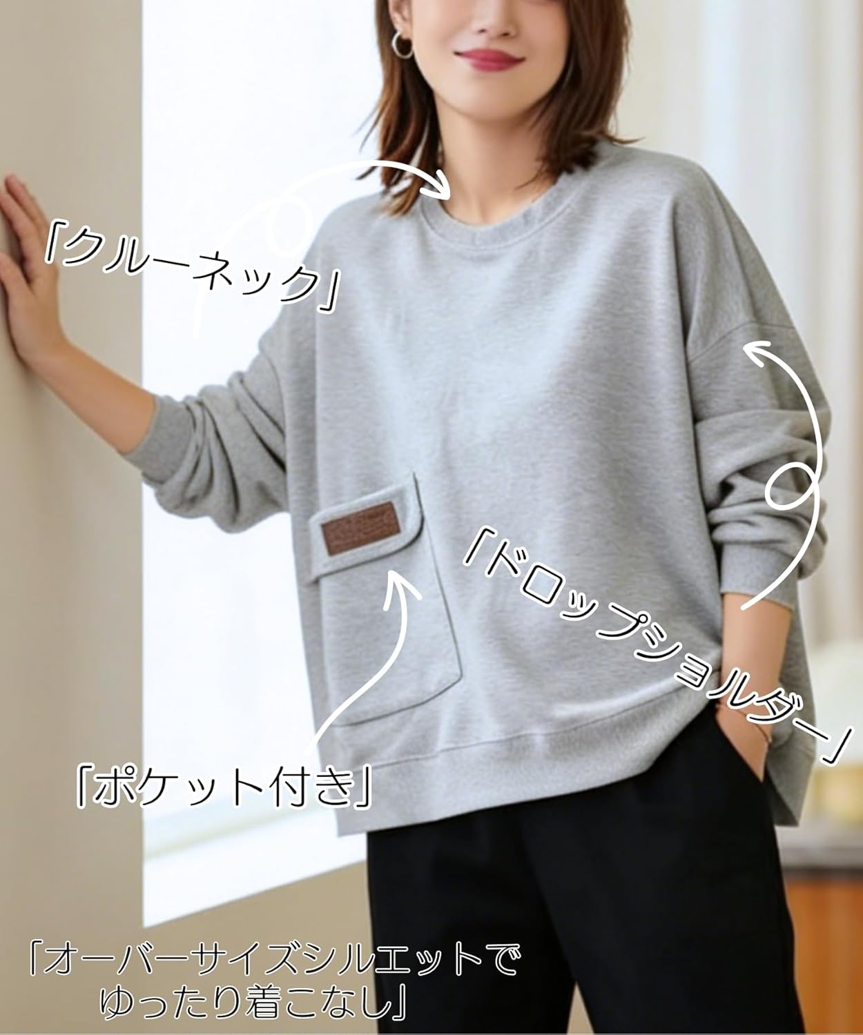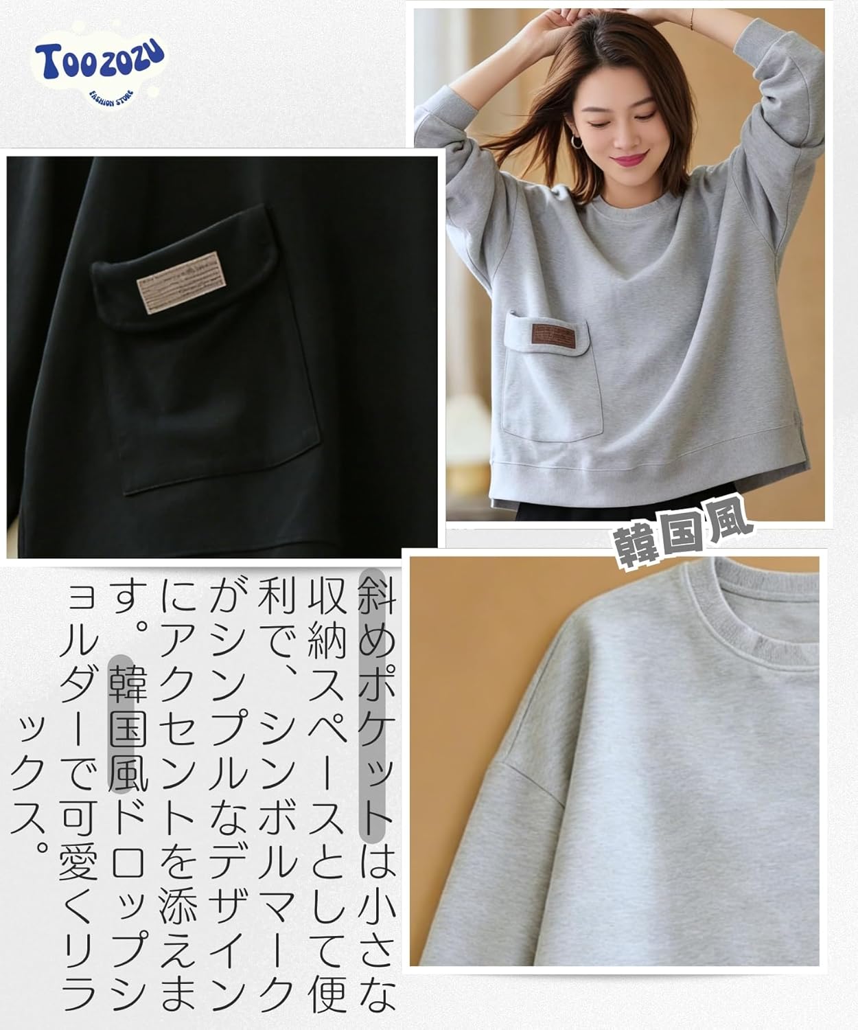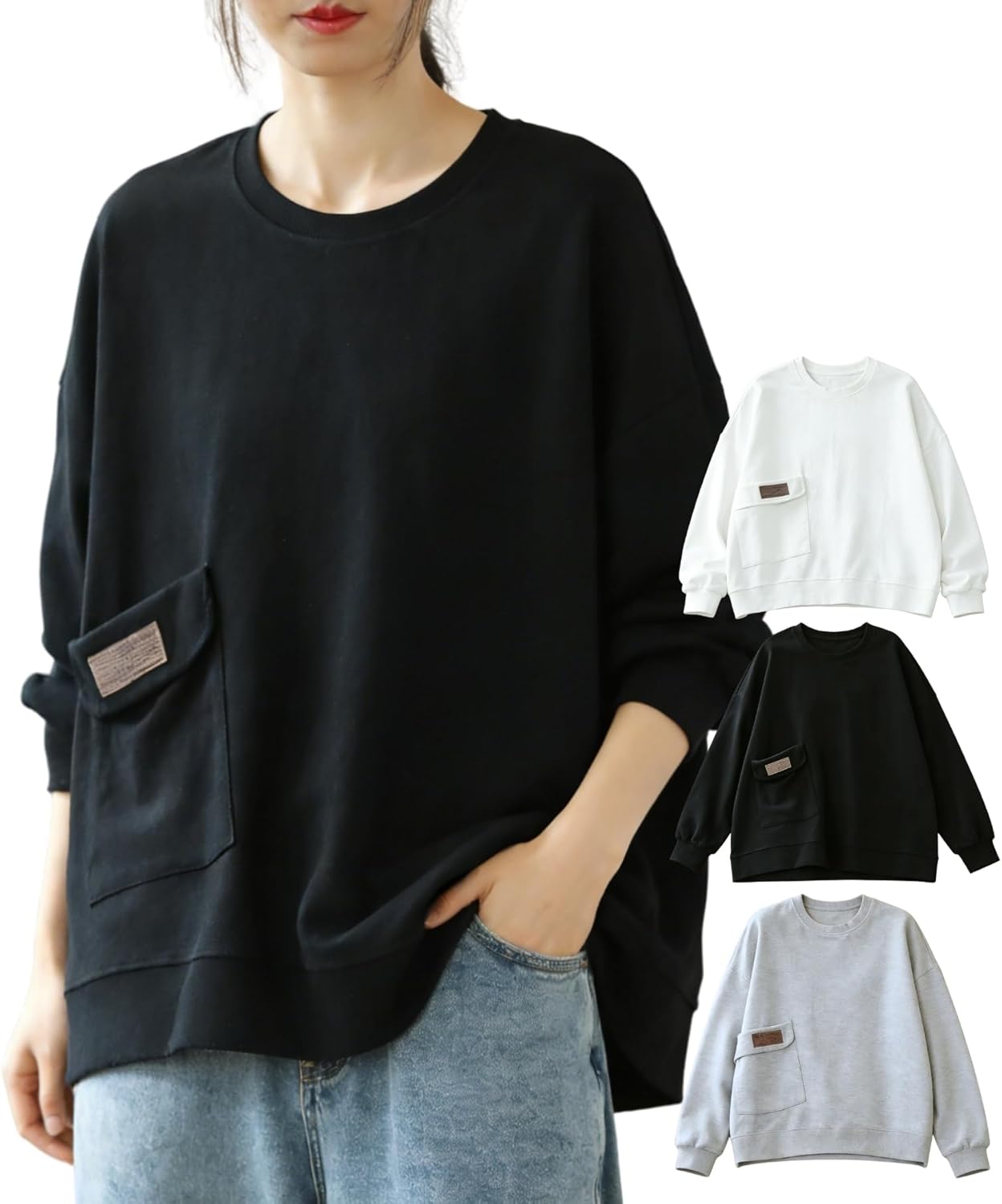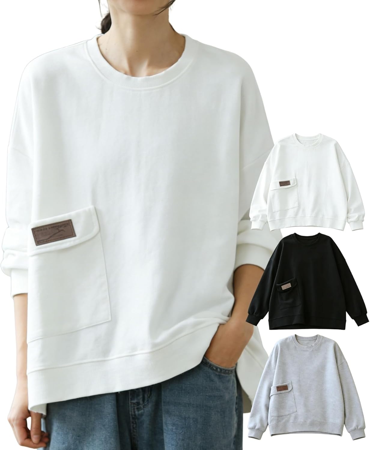 [Toozozu] ポケット トレーナー オーバーサイズ 長袖 - レディース トップス スウェットシャツ 体型カバー ロングtシャツ ゆったり ドロップショルダー ビッグシルエット 着痩せ 着回し 大きいサイズ カジュアル 無地 韓国 春秋冬