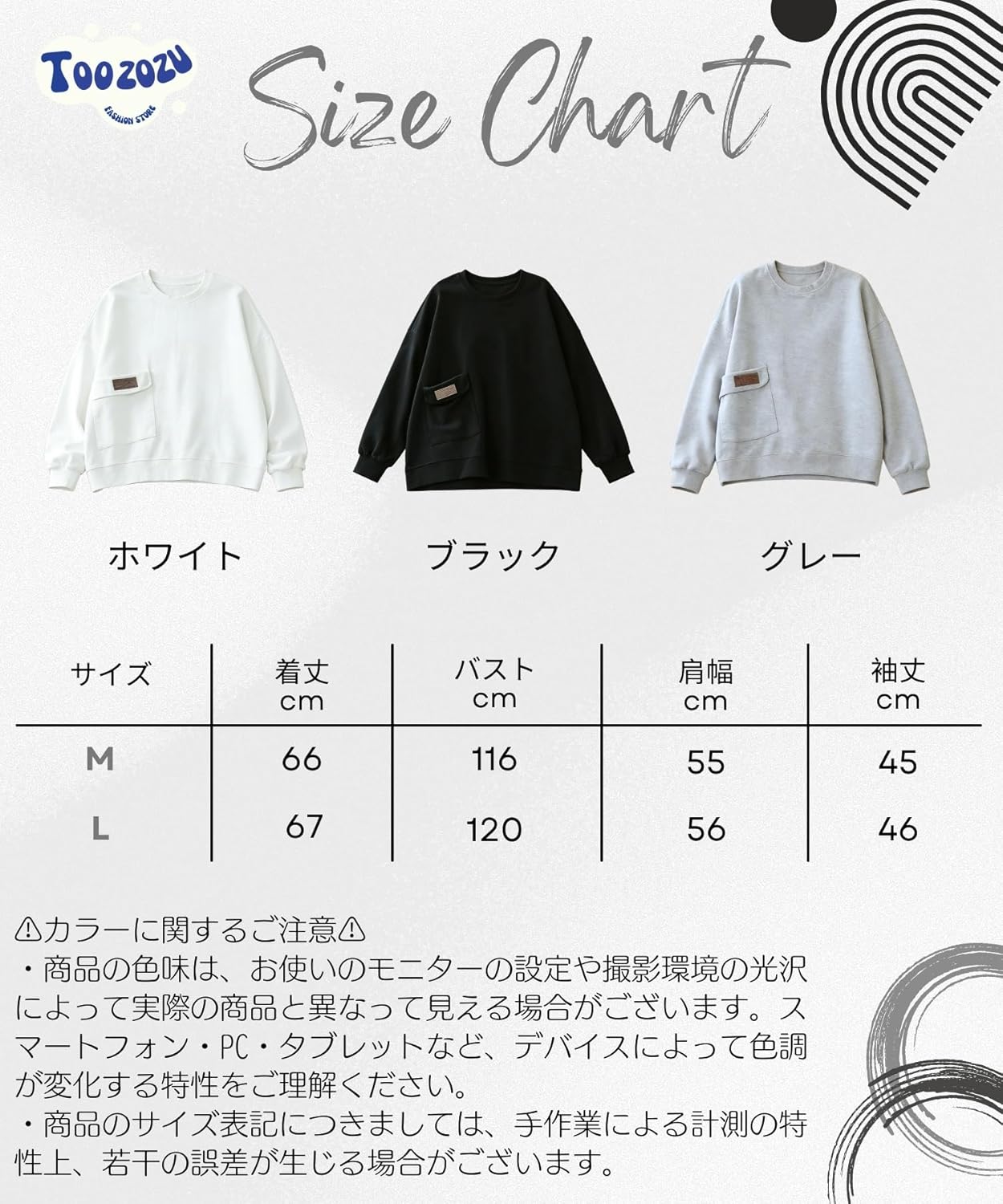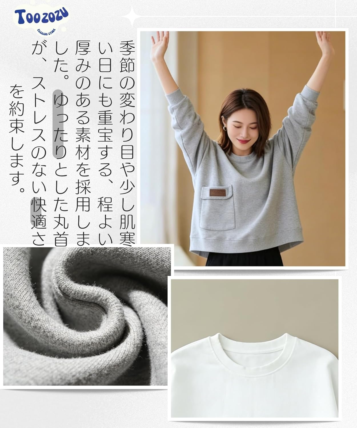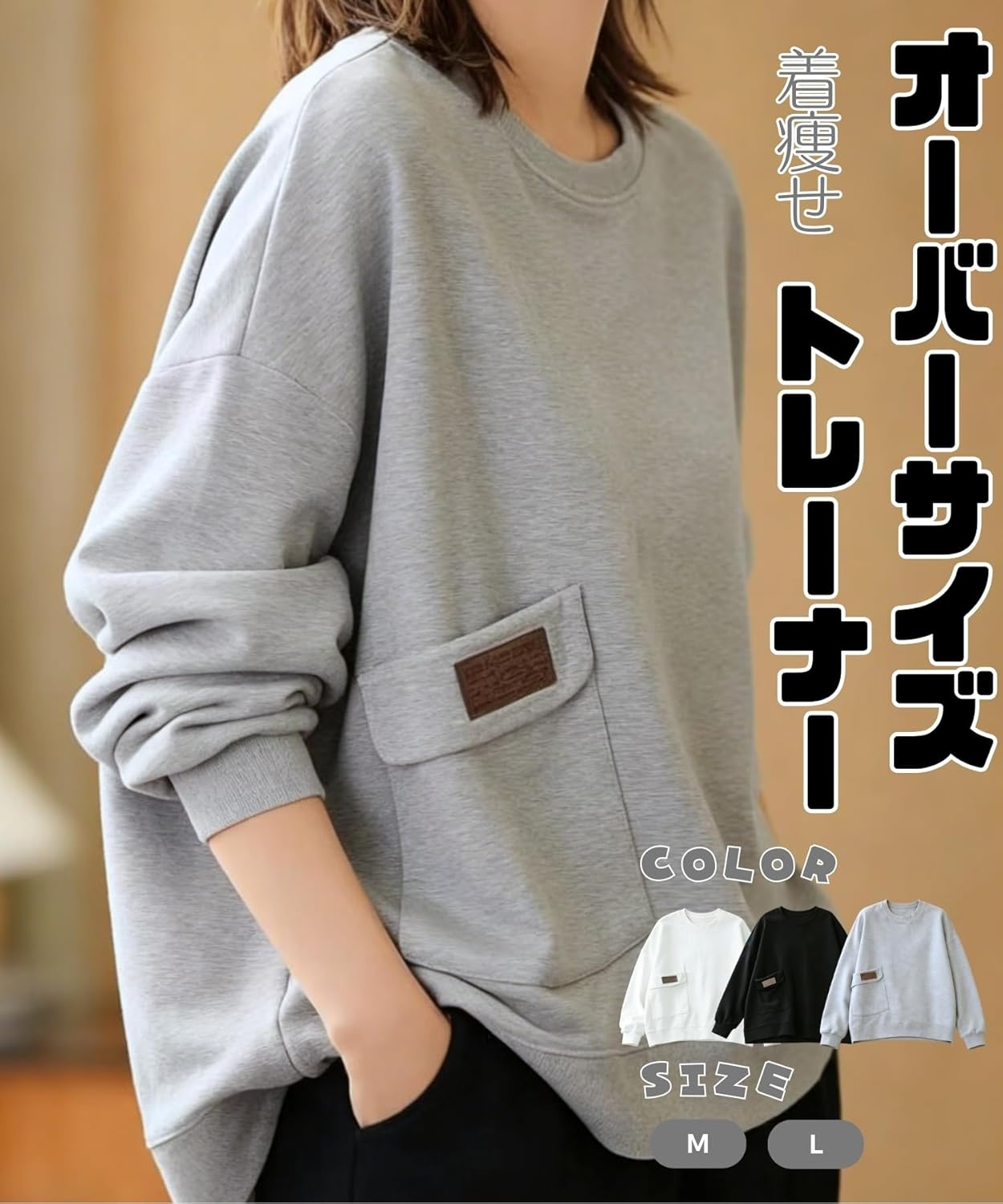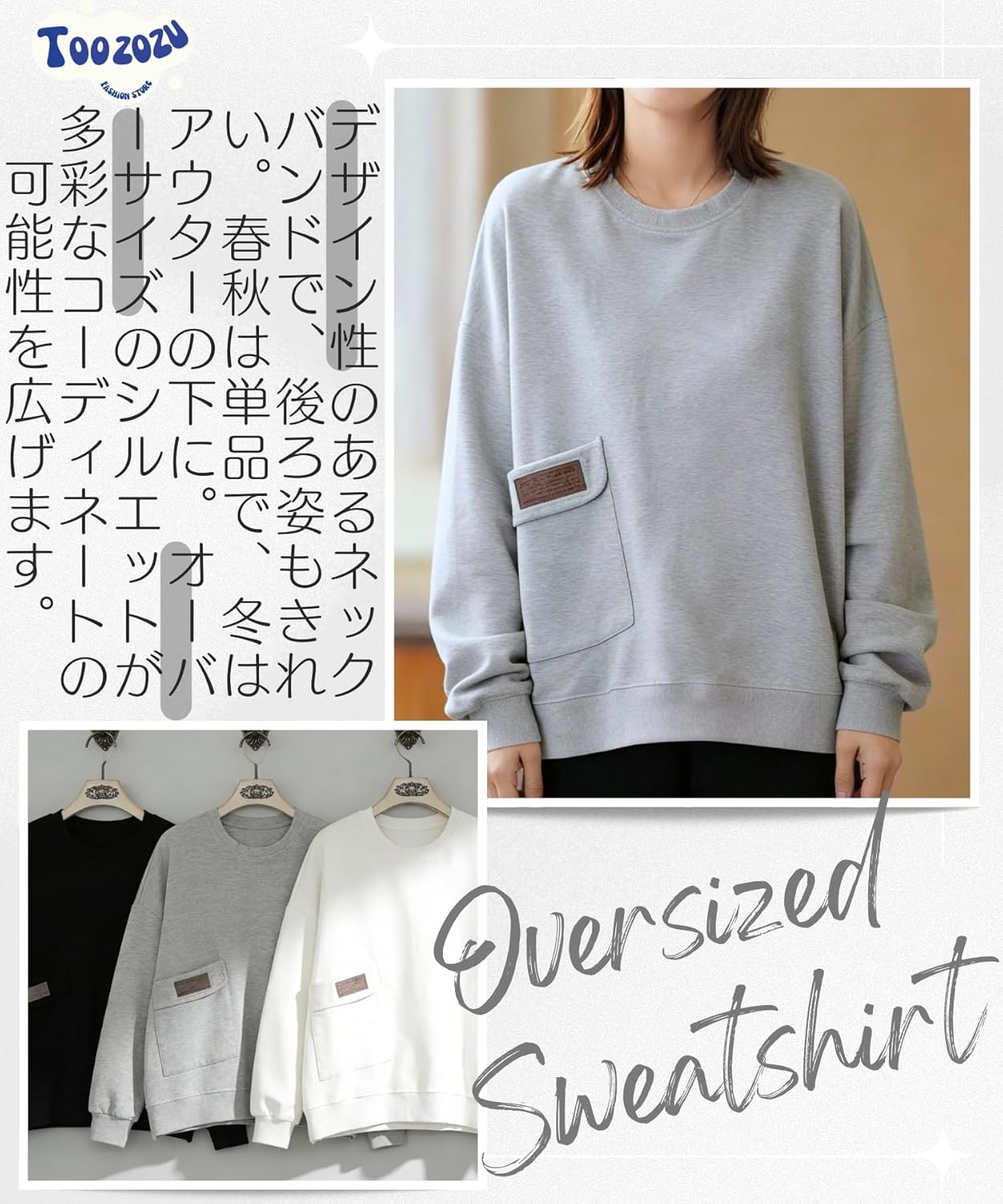 [Toozozu] ポケット トレーナー オーバーサイズ 長袖 - レディース トップス スウェットシャツ 体型カバー ロングtシャツ ゆったり ドロップショルダー ビッグシルエット 着痩せ 着回し 大きいサイズ カジュアル 無地 韓国 春秋冬